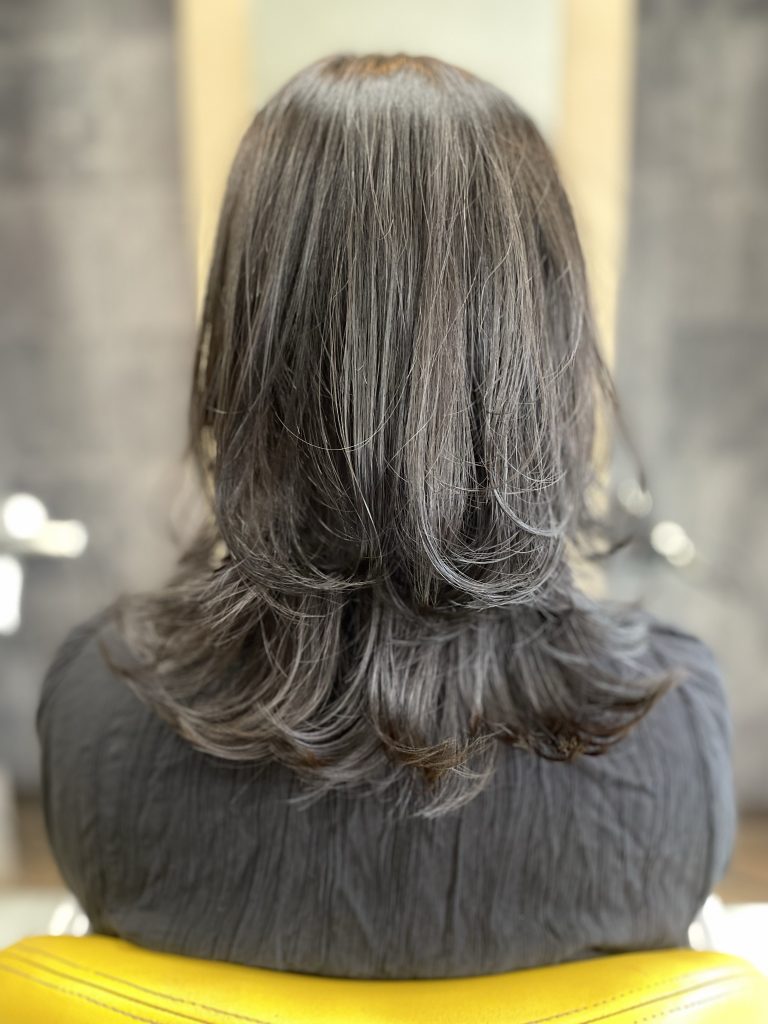 鎖骨ラインでカットした重めのミディアムをベースに、表面と顔まわりにレイヤーを入れて動きを出しています。