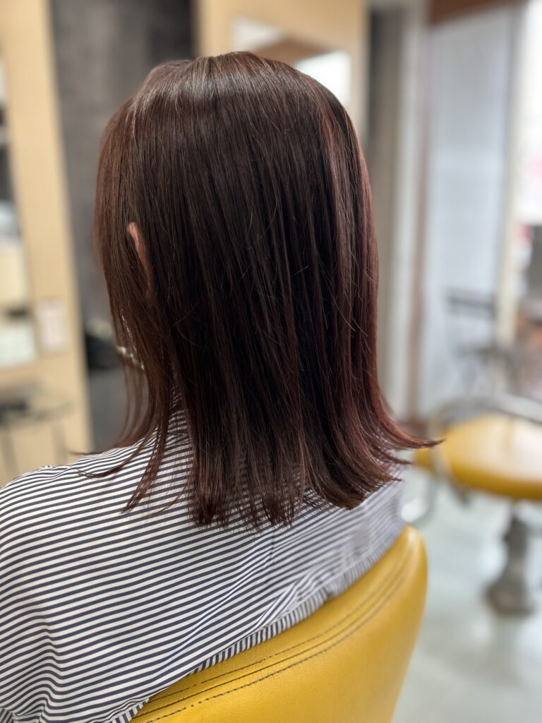 鎖骨下ラインでベースカット。今回のカラーは、ベリーピンク。肌の透明感が高まる色みです!