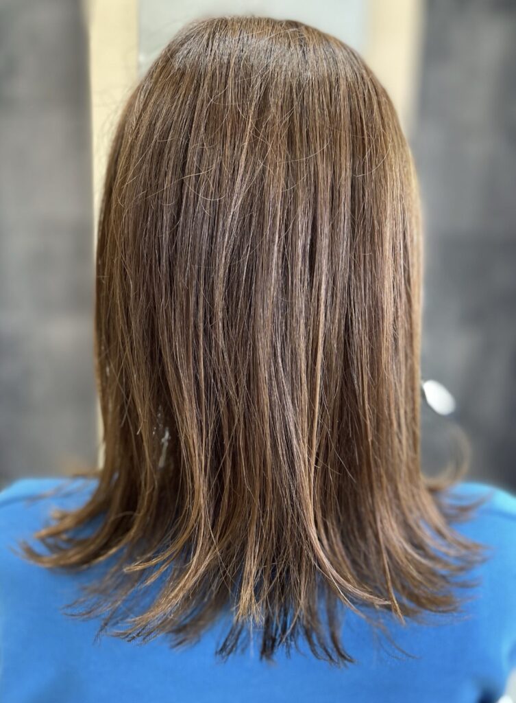 今回は、鎖骨ラインでぱつんとカット。カジュアルになりやすい切りっぱなしデザインを大人っぽく仕上げてます。