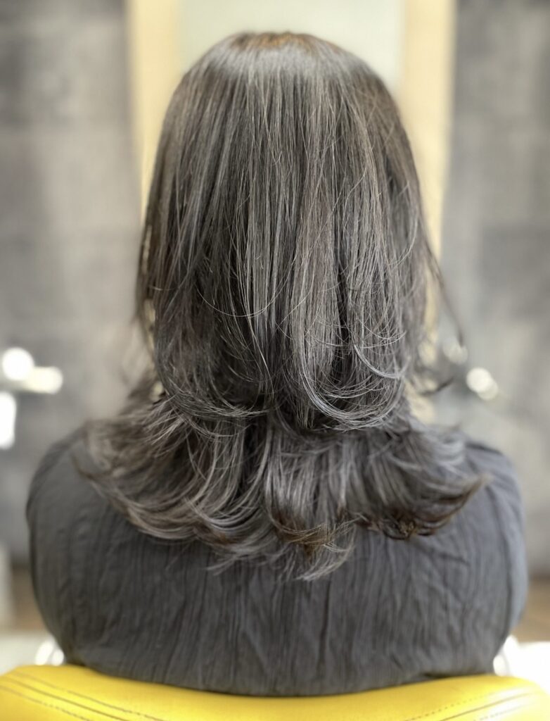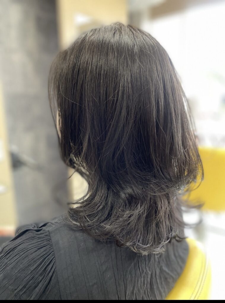 鎖骨ラインでカットした重めのミディアムをベースに、表面と顔まわりにレイヤーを入れて動きを出しています。